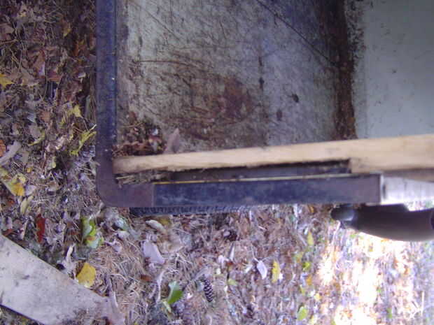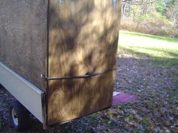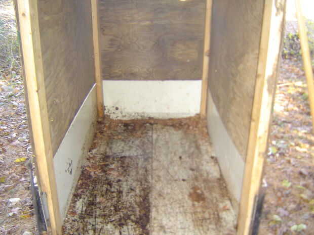 Salí de 1/4 de la parte superior de la caja abierta y cubierta con pantalla para permitir que el aire escape cuando la podadora esté descargando hojas en la caja. La parte posterior de la caja tiene una puerta de las cubiertas de la parte posterior de la caja de conexión con bisagras baratas. Notar el mecanismo de bloqueo de alta tecnología!