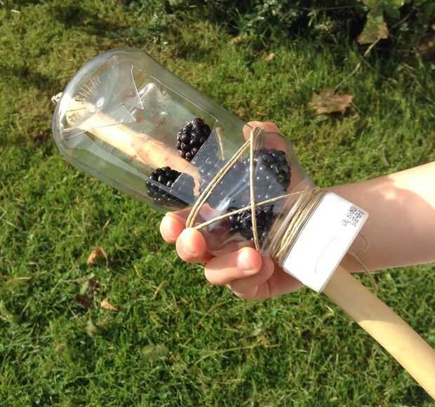 Fin de semana pasado, durante un picnic con amigos los niños manchados un blackberry bush y que, tan pronto como consiguieron la autorización (se comprobó que era realmente algunas moras!) estaban todos felices conejitos recogiendo bayas. Desafortunadamente, es tarde en la temporada por lo que no se la primera de ellas. Personas y las aves ya habían recogido las primeras filas, pero había un montón de grandes bayas de izquierda en el centro, un poco fuera de alcance y protegidos por las espinas. Se trata de cómo la idea de hacer un recogedor de la baya puede hacia fuera. Tomamos algunas botellas vacías (salsa de tomate, agua mineral, etc.) y algunos recolectores de bayas de moda. El producto final es muy eficaz y muy compacta. Ahora está en mi mochila para nuestro próximo viaje en al aire libre!