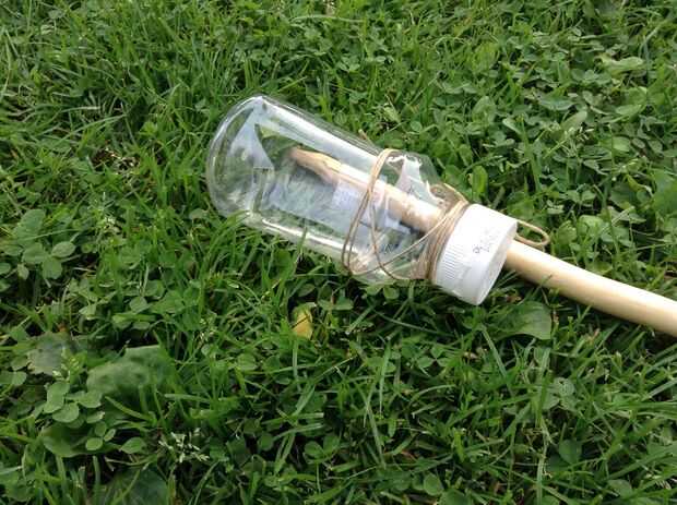 Ahora todo lo que necesita hacer es fijar firmemente la botella a un palo. Sólo asegúrese de que no se deslice de la palanca al tirar, como pueden quedar atrapado en unas ramas o unas espinas.