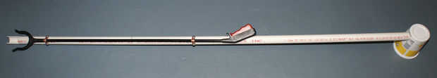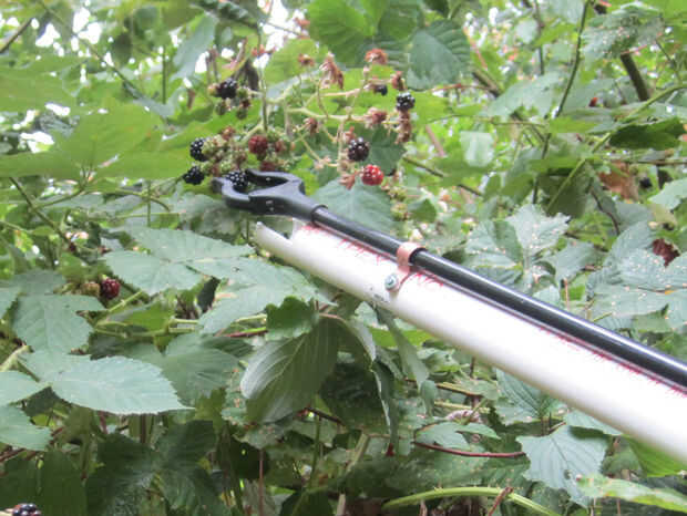 este recogedor de la baya está hecho de tubo de PVC. Calor se utiliza para moldear el plástico. Dos "dedos" en el extremo de trabajo hacen la cosecha. La baya luego cae a través del tubo y aterriza en una bolsa de plástico atada al otro extremo.
