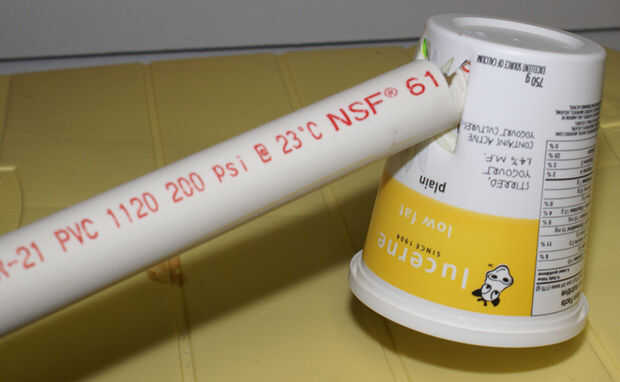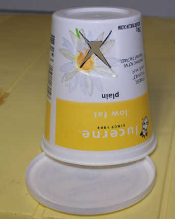 Ahora tomar un recipiente de plástico y dibujar una X no mucho mayor que el diámetro de la tubería de PVC y la X utilizando la cuchilla xacto.  Asegúrese de que el triángulo superior de la X del clip para no meter en el tubo de PVC demasiado (no desea una mermelada de baya en el tubo... mantenerlo para brindis.)  Prácticamente hemos terminado, lo último es colocar el recipiente en el tubo.