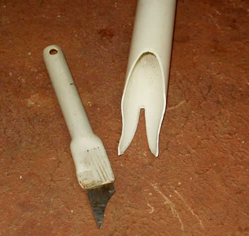 Tenga en cuenta el mango de PVC en el raspador. Era calentado y luego solo exprimido sobre el fragmento de cuchillo para sujetar firmemente.
