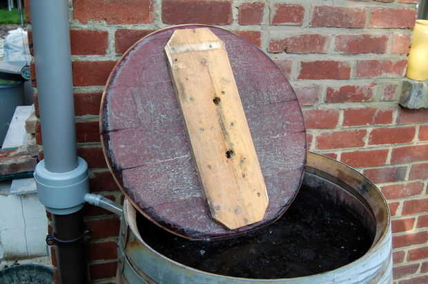 Encontré un viejo pedazo de madera en mi garaje y atornillados firmemente en la parte posterior de la tapa. Me aseguré de tornillos inoxidables (inox). Para poder cerrar el cañón y poner correctamente la tapa en, (y porque la tapa es redonda) tuve que vio las 4 esquinas del tablero, como se puede ver en la fotografía.
