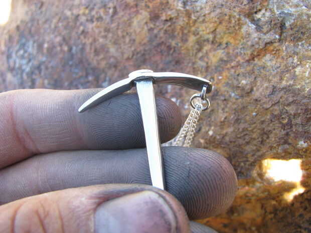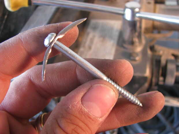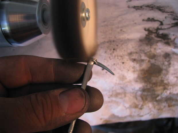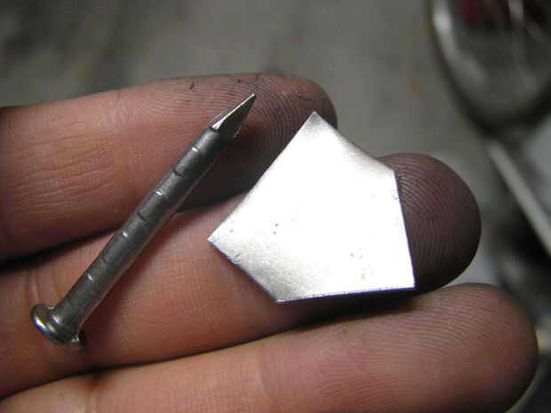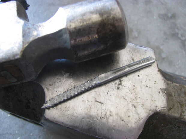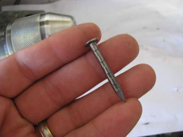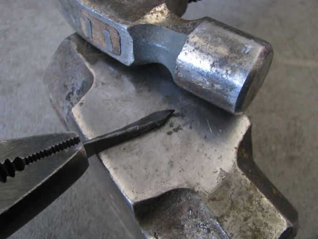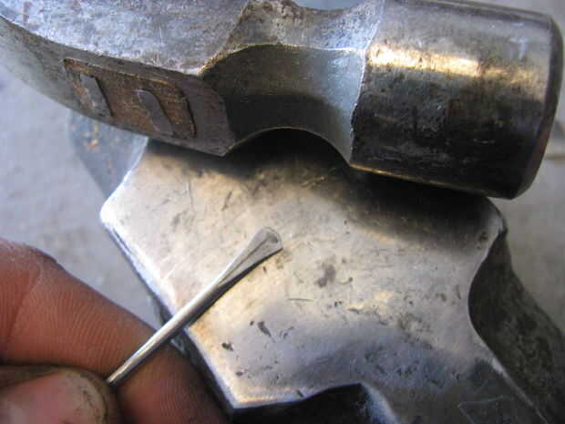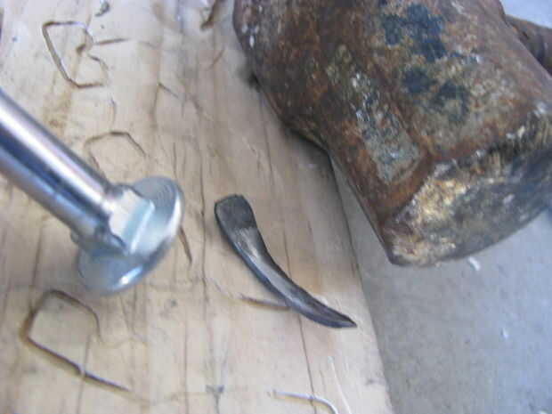 Empecé calentando un clavo y martilleo hacia la forma de un hacha. Yo entonces había refinado la forma con un disco de lija en mi taladro. Después tuve la forma quería que utilicé un puñetazo de cojinete para aplanar una sección en medio de la selección. Un perno de carruaje y el martillo fue utilizado para curvarla. Me perforó un agujero en ella y luego usa una Dremel para ampliar el orificio. A continuación tomó un tornillo para madera y había martillado hacia la forma de un mango. Otra vez usé el accesorio de lijado para refinar la forma.