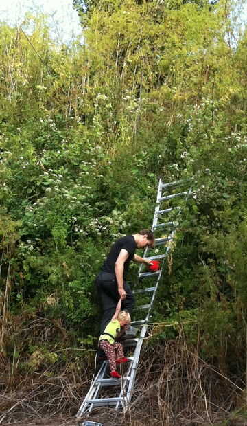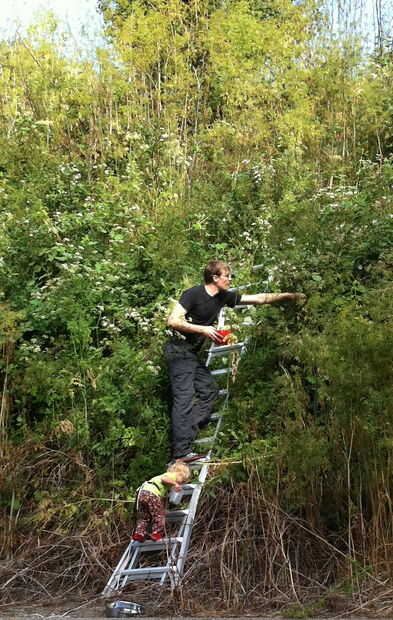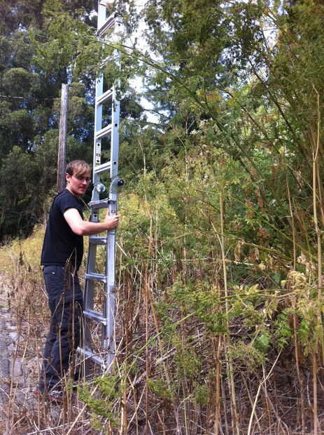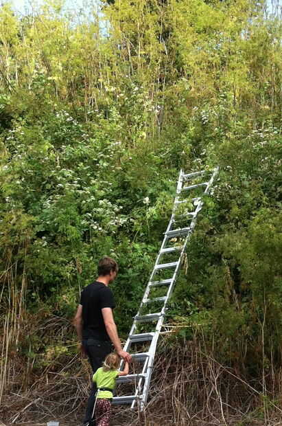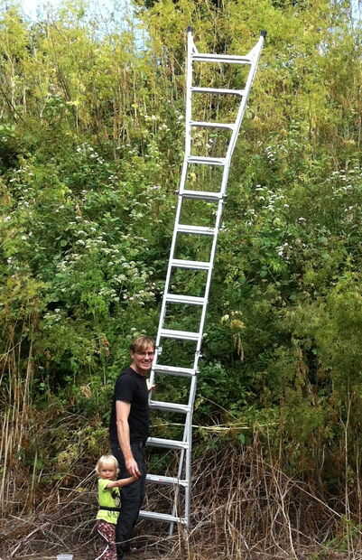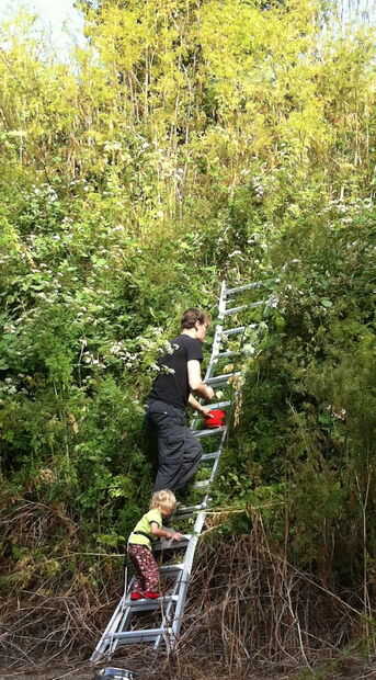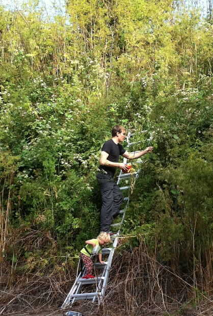 Extender la escalera completo altura, coloque debajo de la motherload de moras solo-fuera de alcance y desplegable en la parte superior los bastones. Es raro que cualquier bastones de rompen, y no te preocupes mucho al respecto porque las cañas son bienales y las bayas van a morir al final de temporada. La raíz de la planta es perenne y continuará creciendo bastones nuevos encima de los secos, muertos. De hecho, no subiendo en la ladera con la ayuda de la escalera, nunca he visto el suelo bajo los pies; esta ladera particular podría compuesta totalmente de bastones blackberry muerto.