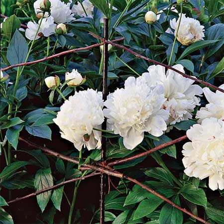 Para mantener las cabezas colgantes de sus peonías 'Festia Maxima' de 36 a 40 pulgadas de altura vertical (recuadro, abajo), Thyrza rodea su cama con estacas metálicas de 3 pies, llevando en el suelo aproximadamente 2 pies aparte cuando las plantas son 1 pie de altura. Entonces ella utiliza las apuestas para garantizar la guita que dirige en una rejilla a través de la cama, justo debajo de las cabezas de la flor, escondidos en el follaje; añade otra red cuando las plantas son 2 pies de altura. "Tener en cuenta la altura de tus peonías para que las apuestas no peguen encima de sus cabezas como si estuvieran en un corral," ella dice. Apple-ramita x atado al exterior de las estacas que se poner una cara bonita de la red.