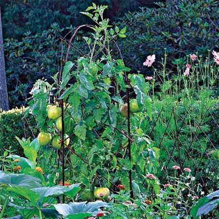 Para dar sus tomates un marco robusto, Thyrza ellos construye una torre de cuatro patas (parte inferior). En primer lugar, ella conduce estacas de metal de 6 pies en el suelo en una plaza de 2½-pie de lado. Entonces ella lazos de recortes de apple directamente en grande x hacia el exterior de las estacas y tapas de la torre con arcos cruzados de ramitas dobladas atada a las estacas opuestas. Tomates maduran a poca distancia.