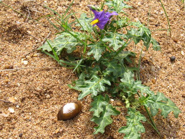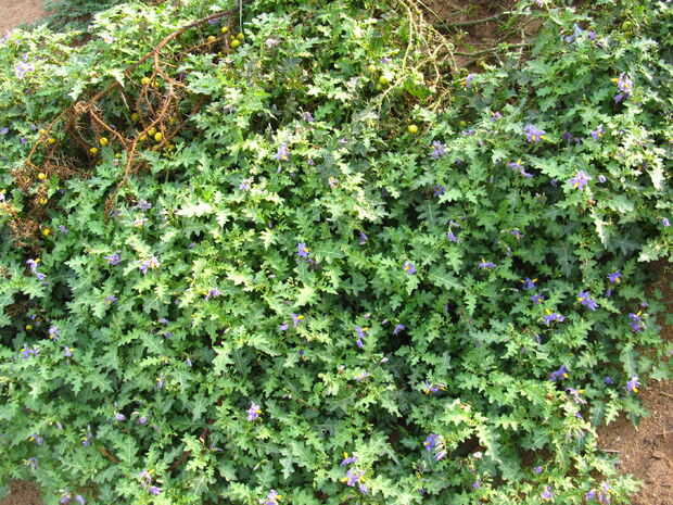 Produce varias ramas que se cargan con espinas rectas, de color amarillos. Las hojas espinosas que son 5 a 10 cm de largo son ovales o elípticas en forma. Las costillas medias y los nervios en las hojas están llenos de espinas afiladas amarillo. Las flores son de color púrpuras en el color y los pétalos son aproximadamente de 2 cm de largo. El fruto o baya que contiene numerosas semillas son color amarillo brillante o blanco en color.