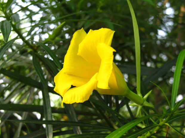 Se trata de un arbusto de floración ornamental grande con hermosas flores amarillas olorosas y hojas verde oscuro brillantes que tienen una capa cerosa que reduce la pérdida de agua. Se encuentra en diferentes variedades como la variedad rosa (Nerium oleander) y los relacionados con Laurel amarillo (amarillo de olor dulce, flores de durazno y blanco y brillantes verdes racimos de finas hojas largas). La adelfa es una planta de crecimiento fácil en la mayoría de las condiciones, especialmente en climas cálidos secos. Es muy popular en la India.
