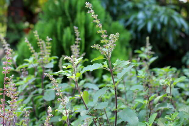 Se le conoce como albahaca Santa en inglés y Tulsi en planta Sanskrit.The de Tulsi (albahaca) es un importante símbolo en la tradición religiosa hindú. Tulsi es una planta venerada y los hindúes la adoración en la mañana y noche. Tulsi es un pesado ramificado que tiene pelo en todas partes. Ha redonda oval en forma de hojas. Sus semillas son planas. Sus flores son púrpura, cremosa en color.
