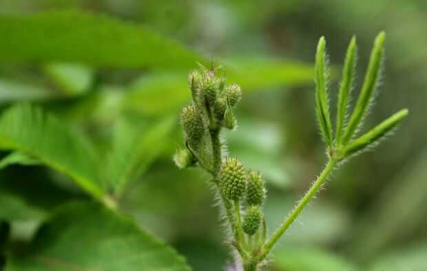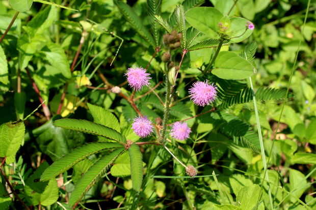 Sensible a la planta crece bien en áreas húmedas. Pueden ser fácilmente identificado por la roseta de hojas compuesto sensibles de la parte terminal de la planta. Los folíolos son colocados uno al otro y normalmente hay 6-12 pares centripetally con las hojas más grandes en la parte superior y las hojas de más abajo. Las flores color de rosa son en muchos pedúnculos. Los frutos son elipsoidales cápsulas que contienen semillas ovoides transversalmente estriadas