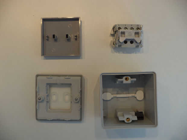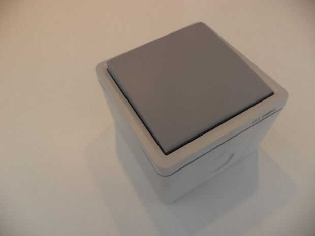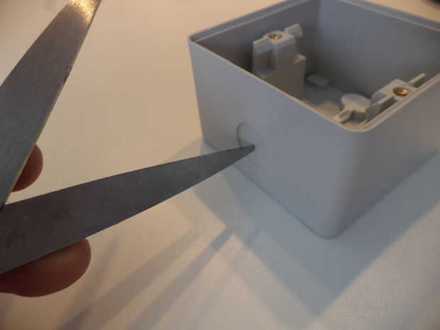 Abrir el interruptor. Empujar los agujeros en dos lados opuestos. Hay dos puntos de círculo suave del interruptor que fueron creados para hacer estos agujeros en.
