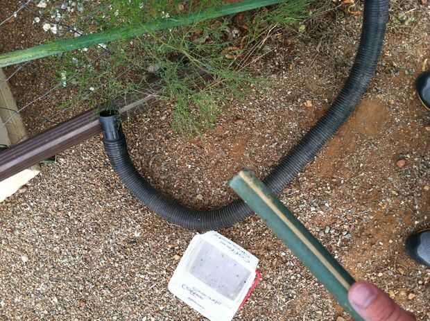 bien construí una cama de flor y quería usar el agua de lluvia a regarlo. Así que conecté la bajada de agua con un tubo de pvc y una manguera de jardín. Ahora el agua es pero mejor uso y distribución lo suficientemente lejos de la casa para evitar cu