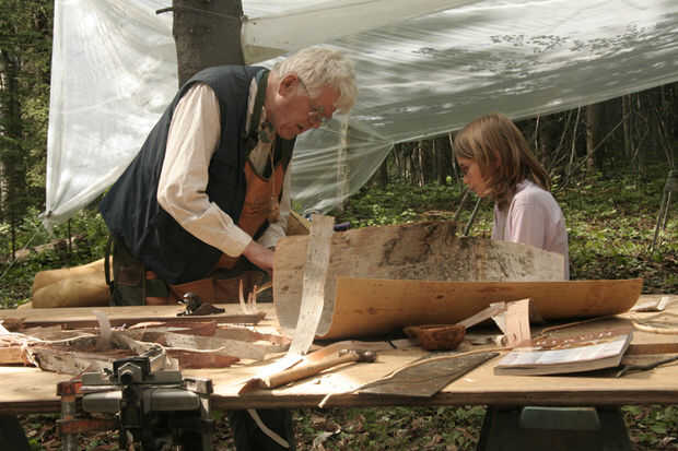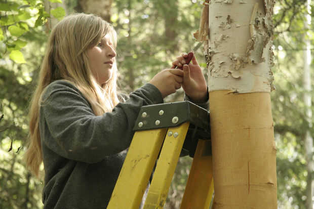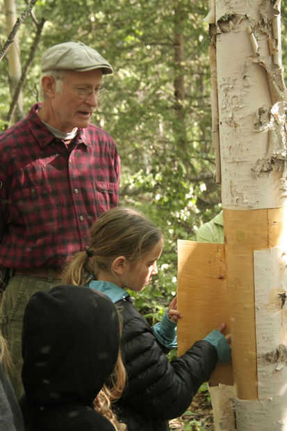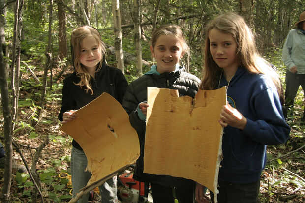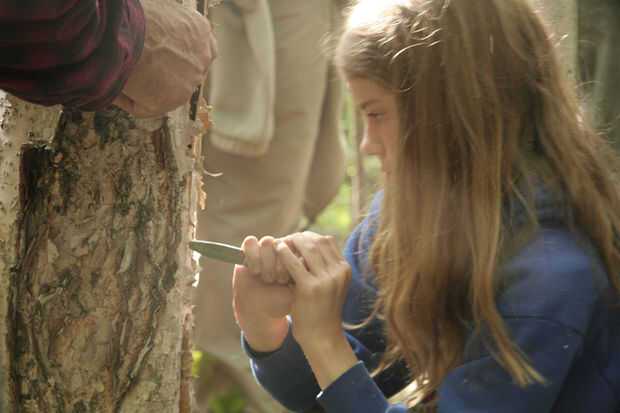 participantes en la semana en el bosque (http://weekinthewoods.org/) corteza de aliso para hacer pequeños recipientes de cosecha. Aliso es arbusto que se utiliza para talla de madera y tabaco carne en Alaska que fijan el nitrógeno de crecimiento rela