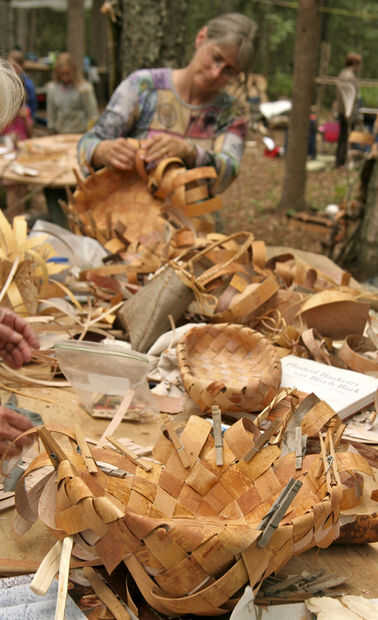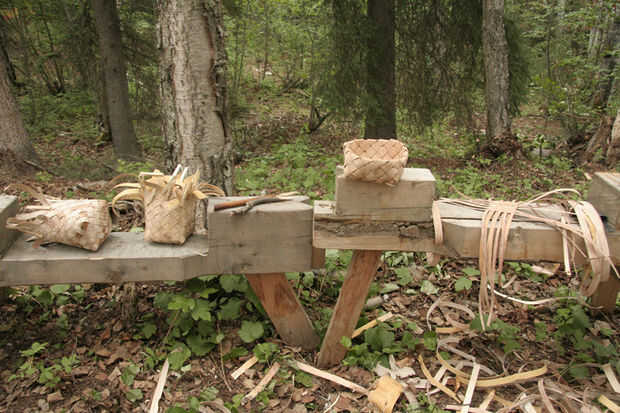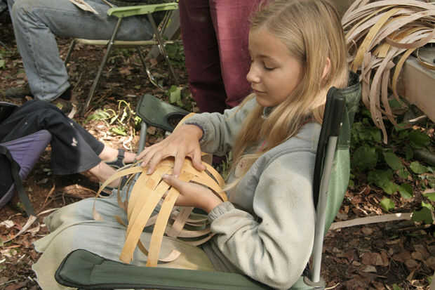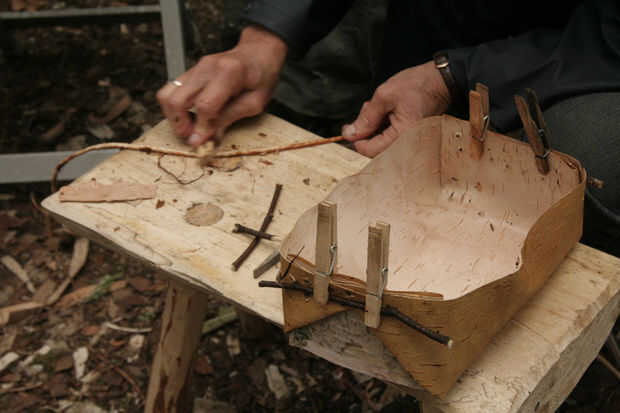 participantes en la semana en el bosque (http://weekinthewoods.org/) corteza de aliso para hacer pequeños recipientes de cosecha. Aliso es arbusto que se utiliza para talla de madera y tabaco carne en Alaska que fijan el nitrógeno de crecimiento rela