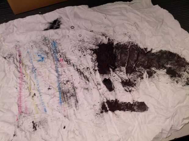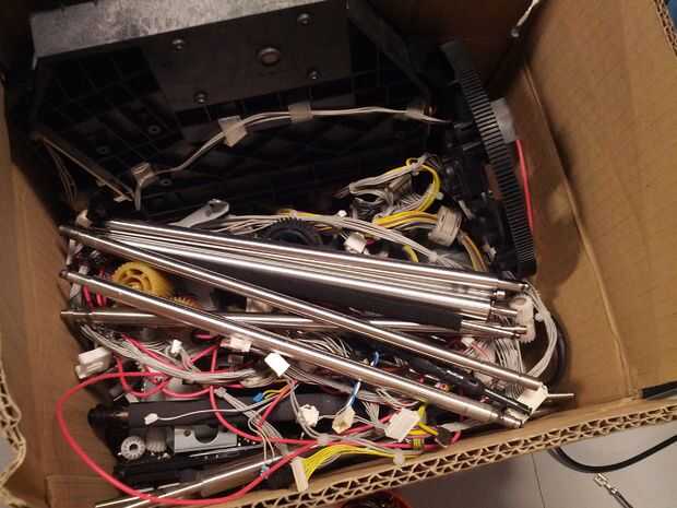 La unidad del fusor fue quitado de la impresora antes de comenzara stripdown, junto con la unidad de conductor de la foto. Son los dos componentes finales a la izquierda en la franja de abajo. Tenga cuidado con la condutcor de la foto, me quité el lado y salió un montón de tóner negro. Afortunadamente el paño de la chatarra estaba allí para capturar todo.