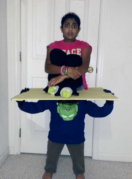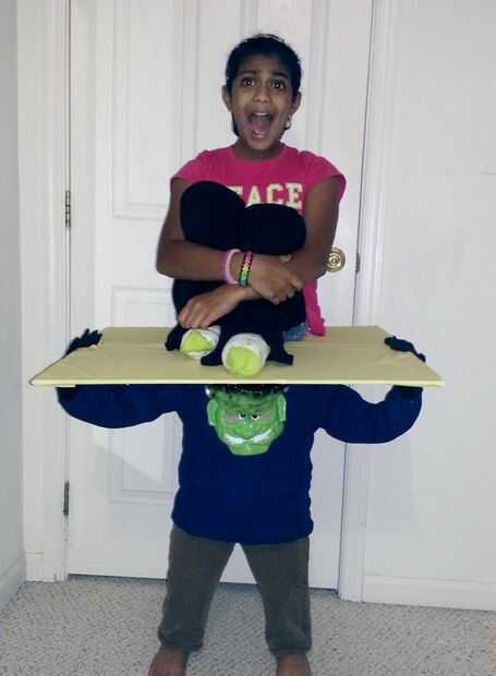 Poner junto - Coloque el mini Frankenstein en el tablero de la espuma cerca del hoyo que fue cortado. Coloque las manos a la junta con cinta adhesiva. El niño va a través del agujero en el tablero a través del cuello de la camisa y los pantalones. Ahora fije las patas falsas para camisa de niño usando pernos de seguridad. Listo el traje está listo. Para hacer el traje más robusto, fije la parte trasera de la camisa de mini Frankenstein a la junta con cinta adhesiva (después de que el niño lleva es vestir el traje).
