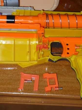 las dos piezas en la foto son mecanismos de bloqueo, que se une generalmente a su gatillo te detiene de ser capaz de disparar la pistola, mientras que la corredera para amartillar está justo detrás y el otro es es para bloquear el botón de lanzamiento de clip, no los necesita.
