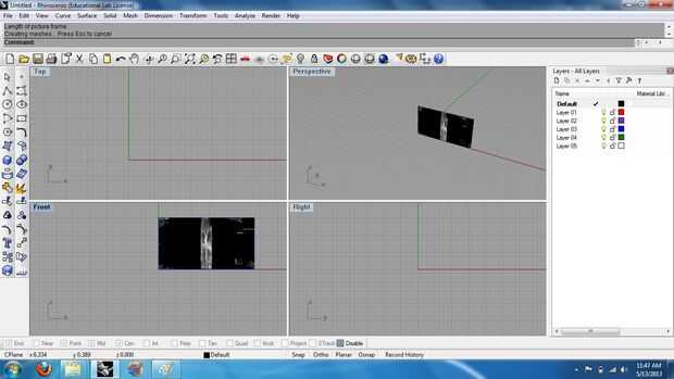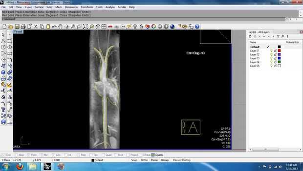 Utilizar la "curva del punto de control" para dibujar una línea alrededor del objeto que se desea hacer 3D, en mi caso fue mi corazón y la aorta. (Figura 3) Es importante apagar Osnaps para esto, para que la línea será en un solo plano y no encaje en otros lugares donde no desea. Utilice el comando de "parche" para crear una superficie a partir de la línea cerrada y luego usar "extruir superficie" para crear una extensión que puede tener volumen. (Figura 4) Asegúrese de que 'cap' está seleccionado, para que los extremos extruidos están capped y la figura es sólida.
