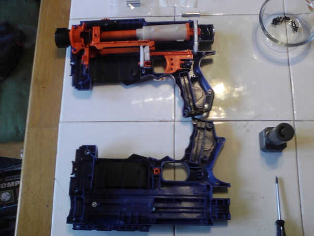 Primero quite los dos tornillos en la parte posterior de la pistola que sostienen el cubierta tubo de émbolo en su lugar.