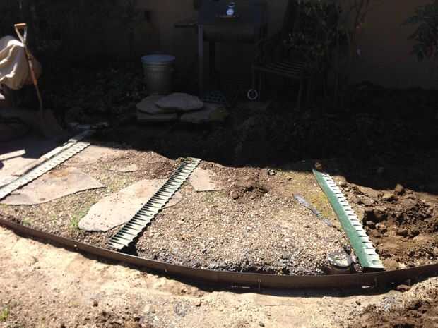 La ruta original fue alineada con secciones de bordes de plástico. Por razones estéticas y personales cuelgues, prefiero usar bordes de metal. Haber utilizado EasyFlex aluminio paisaje bordeado en un proyecto anterior, fue con eso. Fácil de usar, fuerte, y parece buena. Este fue el único material que tuve que comprar para el proyecto; todo lo demás fue puesta alrededor de mi tienda.
