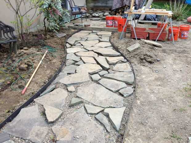 Los adoquines de la vieja ruta fueron, por suerte para mí, en una amplia variedad de tamaños y formas. Como embalar un bolso de compras, puede empezar con las piezas grandes y luego rellena con el más pequeño. Al hacer este tipo de cosas, es importante colocar todo por adelantado, antes de la colocación final. Esto asegura una distribución uniforme y sin sorpresas en el final cuando los pedazos restantes no llenan la forma que desee. Durante este proceso hubo muchas veces donde robó un pedazo de una sección anterior porque encontré un uso mejor para él.