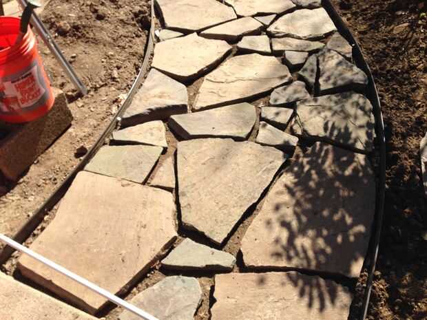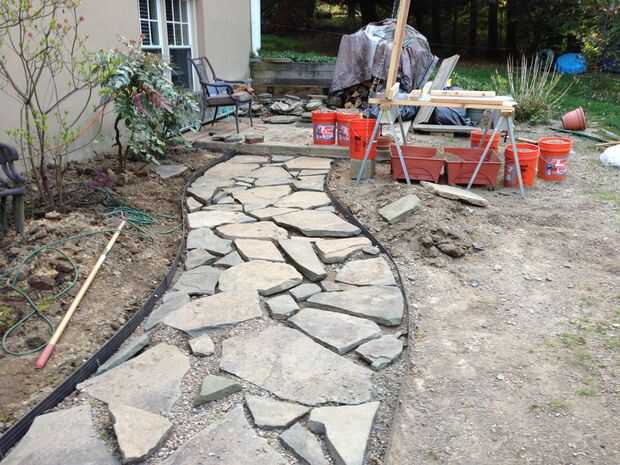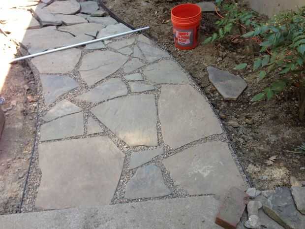 Yo haría cerca de dos pies de camino, colocación y nivelación de pavimentos, luego volver y empezar a llenar con la gravilla para mantener todo en su lugar. Verter en la grava a nivel de todo el recorrido fue bastante satisfactorio.