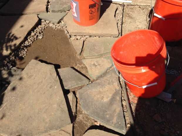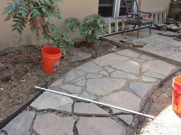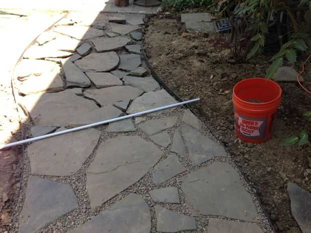 El ribete ayudó mucho con esto. Tengo una larga barra (uno blanco en las fotos) y utilice para asegurar que levanté a cada pavimentadora a la altura correcta. Esto fue un proceso repetitivo de echando un vistazo la diferencia por debajo de ella, vertiendo en grandes rocas para llevar cerca, colocación de la pavimentadora para probar con la barra blanca, escogiendo encima de volver a sumar o restar las rocas y repetir. Después de un tiempo, consigue una sensación para él.