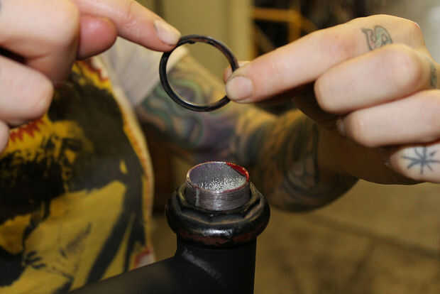 Tomar la raza superior ajustable inferior y atornille abajo el tubo de dirección de la horquilla hasta que se sienta en los cojinetes.