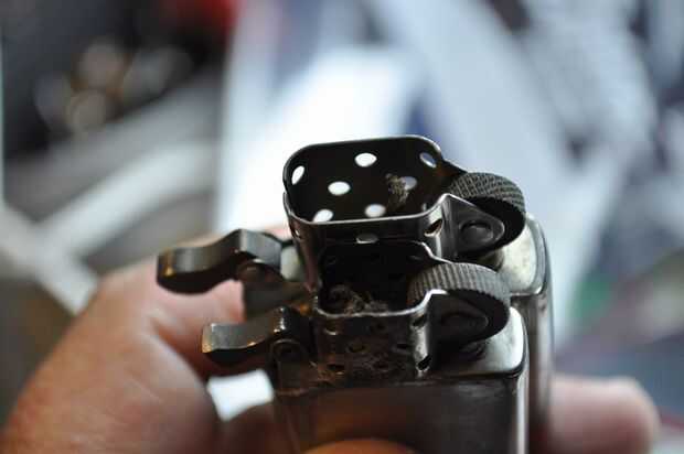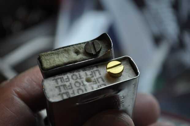 Zippos usar líquido encendedor. fluido de encendedor huela ofensivo para algunas personas, puede irritar la piel y puede dañar plásticos y pinturas. es obviamente altamente inflamable. Tenga cuidado cuando usted tira hacia fuera el inserto en un encendedor recientemente lleno, el líquido puede gotear hacia fuera.
