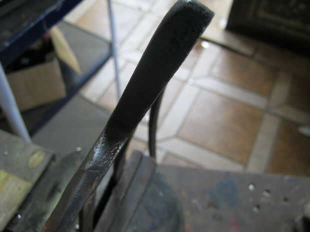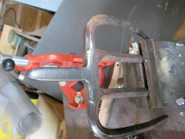 Tome el extremo del negocio de la horquilla y en palo en un tornillo de banco. tomar el accesorio de la rueda de alambre y ponlo en ye olde amoladora. hacer el oxidado, capas indeseables carbonizadas e ir buh-bye.