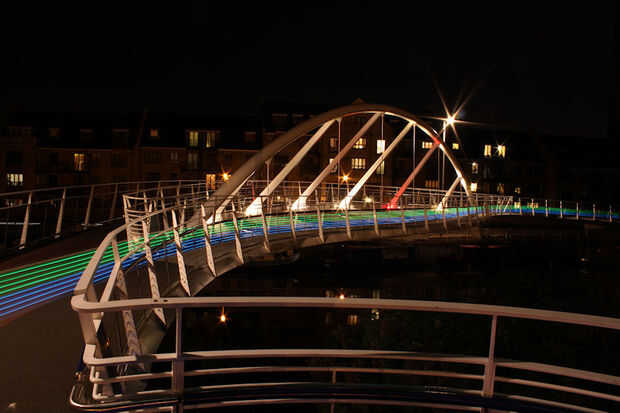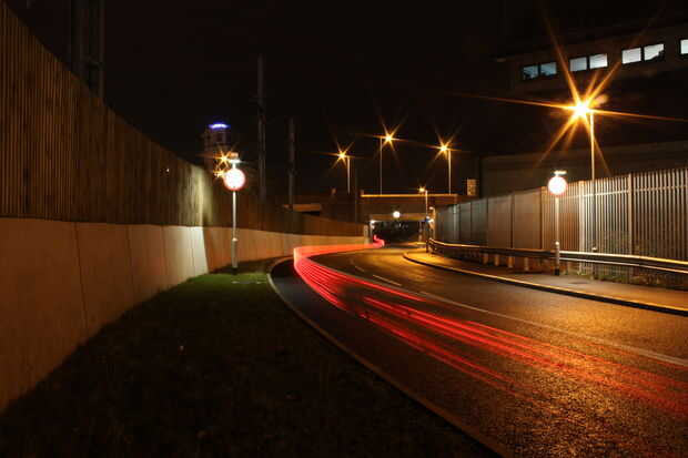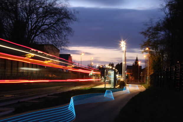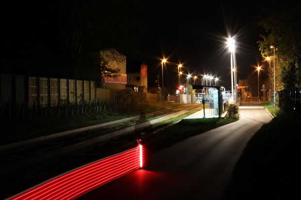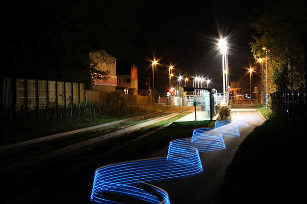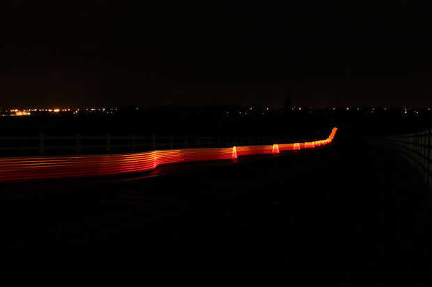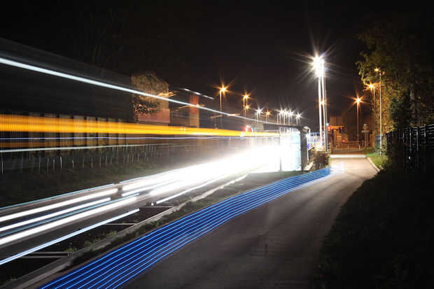 Para conseguir diferentes intensidades de luz, Simón se le preguntó para desplazarse a diferentes velocidades a través de las exposiciones. Luces de aspecto grueso muy intensas son el resultado de ciclo lento con una exposición más larga mientras que las bandas diluyente rápido-en busca de la luz son ciclismo más rápido y una exposición más rápida. Para obtener las luces adicionales de los autobuses sólo esperamos uno venir a lo largo y Simon lo perseguido o ciclos hacia ella dependiendo de la dirección de que venía.