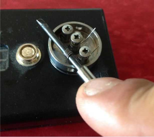 Asegúrese de que la bobina está en el lado del orificio de aire del atomizador. Una vez ambos extremos por los agujeros de poste, apriete los tornillos del poste.