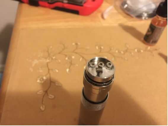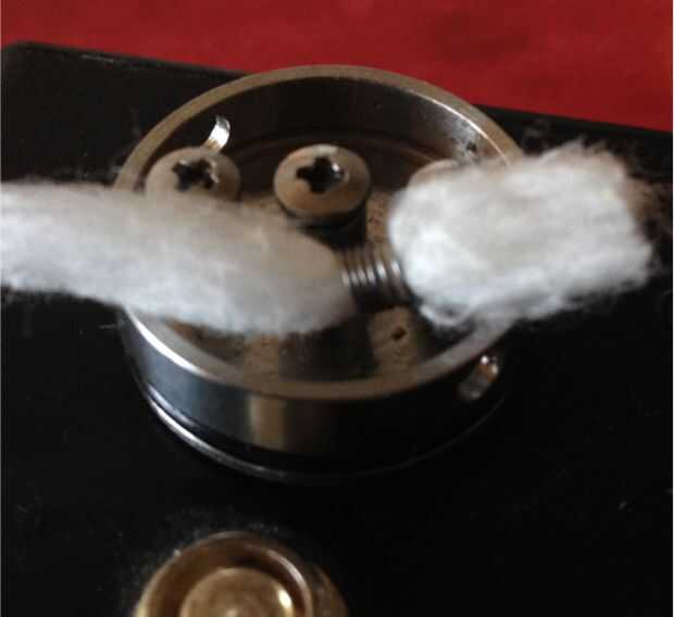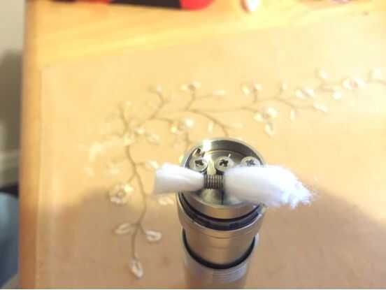 Tomar una pequeña cantidad de su material de drenaje deseado (en este caso de algodón) y alimentación a través de la bobina. A continuación, usted quiere cortar el extremo de la mecha cerca del borde de su atomizador. Finalmente, meter la mecha restante en su pozo de goteo debajo de la espiral en ambos extremos.