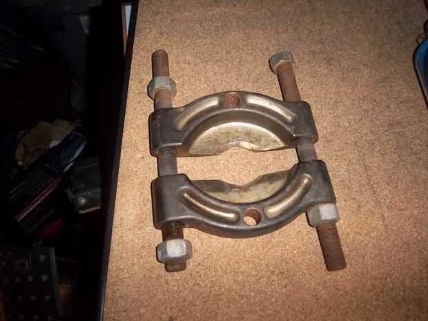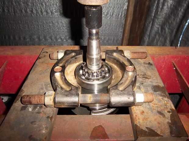 Para este paso necesitarás una linterna, rodamientos y una prensa de la tienda (yo uso una prensa de 20 toneladas). La mejor manera de sacar la marcha sin daño es la marcha con la antorcha de calor. Poner el tirador del cojinete en el cojinete entonces empezó a calentar la marcha al apretar el tirador del cojinete. Esto empezó a tirar del cojinete y del engranaje de pero todavía necesita la presión para terminar el trabajo. Una vez que transfiera la manivela sobre a la prensa poner un socket o algún otro protector en el extremo del cigüeñal para no dañar el extremo. Aplique presión constante en el extremo del cigüeñal hasta que el cigüeñal se separa del engranaje y cojinete. "" Importante"" hacer seguro que tienes la parte inferior de la manivela para que no caiga en el suelo!!!!