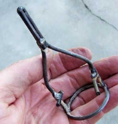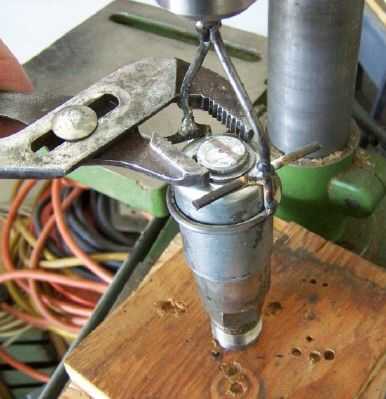 La tercera foto muestra cómo se utiliza esta herramienta especial. Tiraron esta herramienta en mi pequeño taladro. El círculo de alambre en el extremo de la herramienta se coloca sobre la parte superior de la tapa para el montaje del émbolo. Las dos piezas rectas soldadas través permiten la pluma del taladro para ejercer presión hacia abajo y a colapsar la primavera por lo que puede colocarse el anillo "C". Aviso que el extremo inferior del cuerpo de émbolo presiona contra la madera tan la lisa superficie mecanizada no está rayada. Utilicé una pinza ajustable para cerrar el anillo "C". Mi taladro ha limitado ajuste. Usé un par de piezas de madera en la base del taladro con el fin de alcanzar la distancia deseada entre el mandril y la superficie de apoyo al final suave del émbolo.