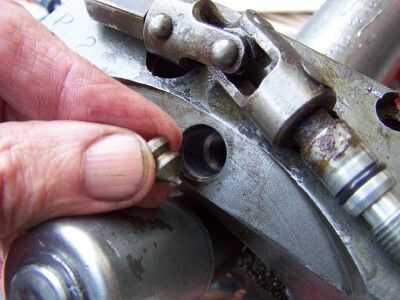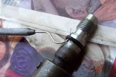 Segunda foto--instalar el sello metal cónico en el agujero para la válvula de escape. La punta va en primero. TAMP en él con un pequeño destornillador para asegurarse de que se asiente en el fondo del agujero. Enrosque la válvula de liberación en el orificio.