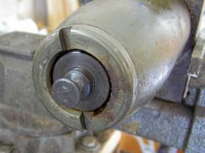La tercera foto muestra la herramienta en uso. Marque las casillas de texto amarillo. Mi tornillo de banco no tenía suficiente influencia para mantener la unidad de salida de la botella, así que atornillado vertical en el marco de la toma y utiliza el marco de jack como mi propia larga barra para el apalancamiento. Para hacer ese trabajo, yo planté mi pie contra el extremo del marco que no se muestran en la foto. Tuve que golpear muy duro con un martillo de bola 16 onzas, pero después de cinco o seis golpes, la tuerca de ram comenzó a moverse. Mi herramienta de trabajo y pude aflojar la tuerca de la ram con la memoria ram para el retiro de la unidad de salida de la botella.