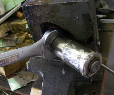 Cuarta foto-- Coloque la unidad de salida de la botella en un tornillo y una llave para quitar el mecanismo de émbolo. Tuve que golpear en el extremo de la llave con un martillo para aflojarla. Mi gato necesitaba una llave de 1 pulgada.