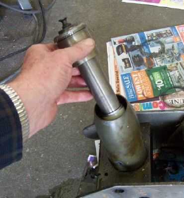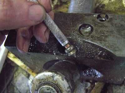 Tercera foto: Desenrosque el ensamblaje de junta universal para la válvula de escape. Inserte una herramienta magnética y extraer el enchufe en forma de cono. El agujero del cual vino es visible detrás de la herramienta de imán.
