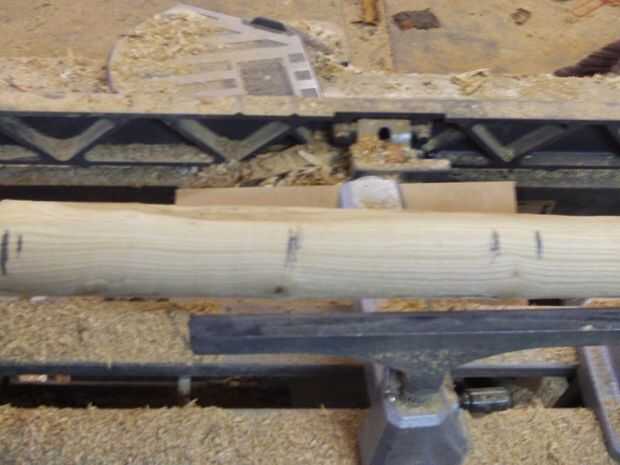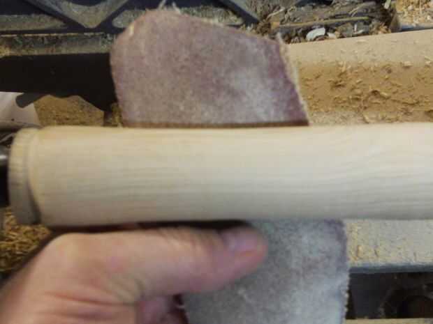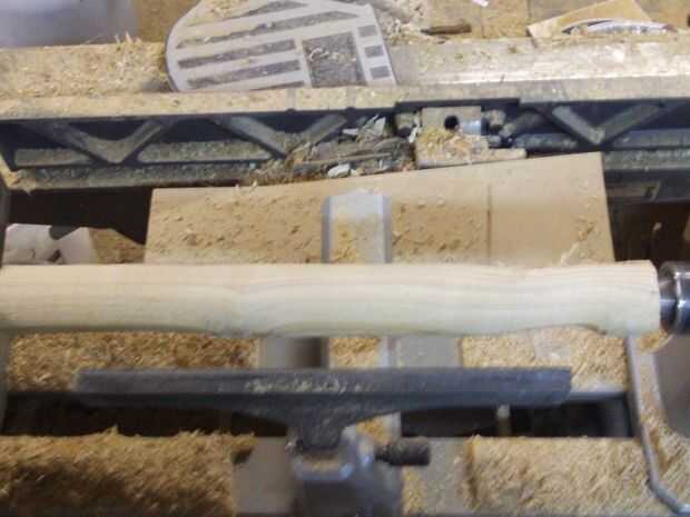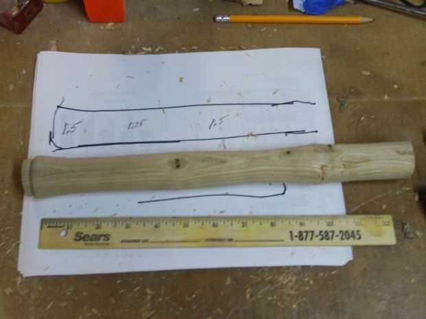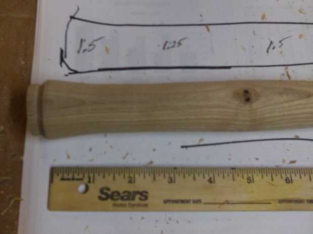 El mango fue marcada en donde tendría puntos altos, puntos bajos, el extremo de la manija y el extremo de la cabeza. El mango fue rechazado al diámetro deseado y áspera lijada con lija de grano 100.