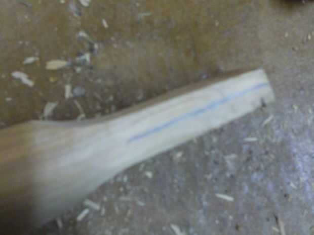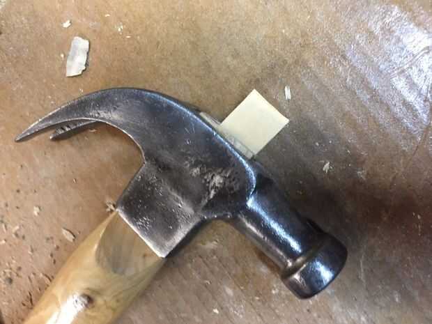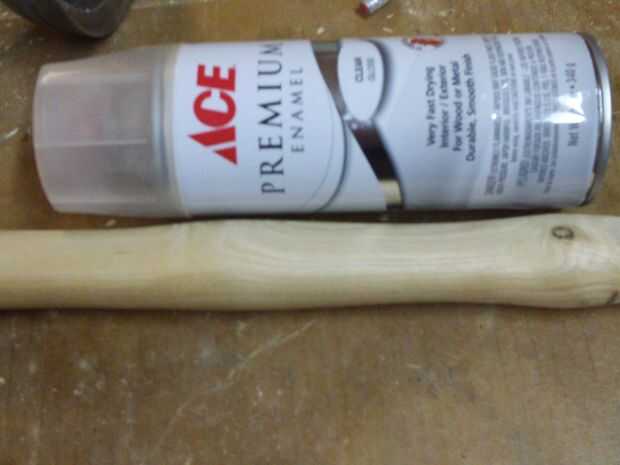 El extremo del mango es marcado para dividir para cuñas. Fractura en la sierra. A continuación se rocía con un par de capas de clear as de esmalte. Cuando el acabado se seca el mango es golpeado en la cabeza. Una cuña es hace y golpeado en el extremo de la manija en la cabeza del martillo a sostenga el mango. Al final acabado se lija suave en la lijadora de banda.