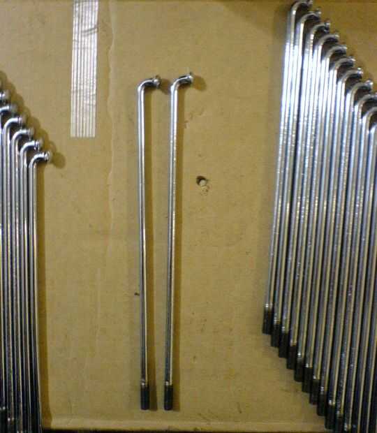 Aquí voy a hacer frente a la rueda delantera, teniendo en cuenta que hay 2 tipos de radios en la rueda delantera. Hay el poco más largo 144mm uno y un más corto uno 142 mm. Además de la longitud del rayo, la 2 tipo también tiene diferentes cantidades de curva en el gancho, que puede verse más claramente en la segunda foto.