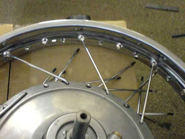 Una vista más cercana del ángulo de los radios a la llanta y eje, de esta forma caen naturalmente en sus respectivos agujeros, también puede verse el espacio habla de 4 orificios.