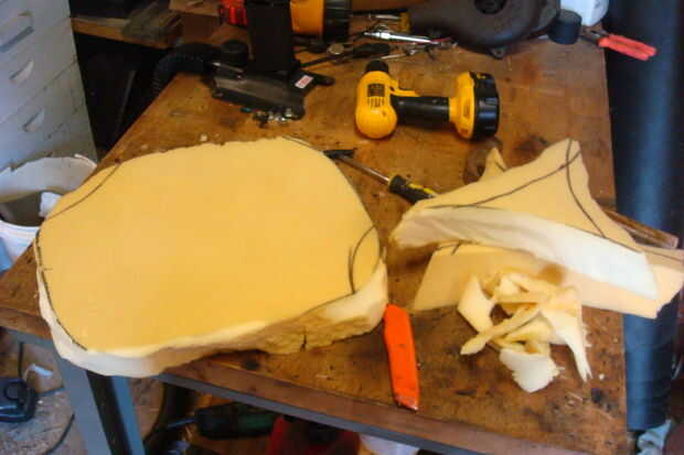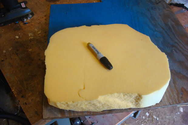 Sentó la espuma en la madera contrachapada y había remontado hacia fuera a continuación, cortar con una sierra de calar. Como se puede ver, no es muy apuesto, por lo que llevó a la madera contrachapada a la lijadora de banda y redondeado hacia fuera y la forma general un lil' más suave. Entonces me senté en la espuma y cortar para que quepa. ¿Complicado lo suficiente?