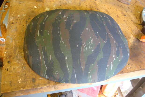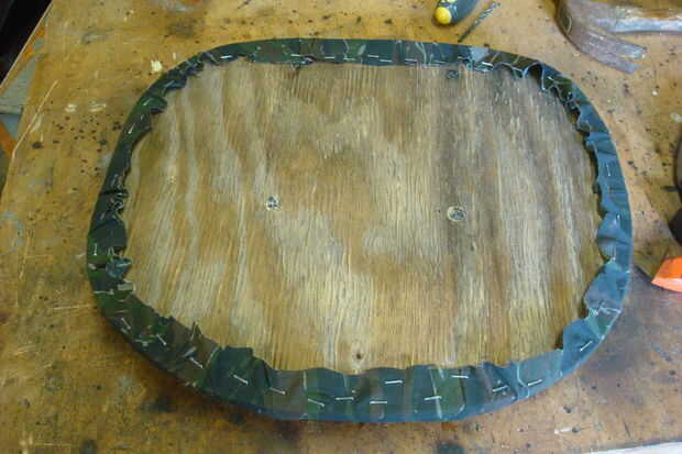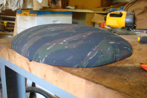 Afortunadamente, es bastante fácil de hacer. A cortar la tela para que quede más agradable, pone sobre la espuma en el asiento y tapa todo. Mientras grapado todo estire a la tela. Mantiene las arrugas de la parte superior y alisa sobre la espuma. Es una tapa muy bien con cúpula. Después de que simplemente recortar la tela sobre ¾" de las grapas para que no se ve demasiado desordenado y está bueno para ir.