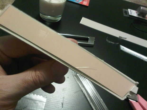 Ahora a preparar la carcasa. Elegí algunas tiras delgadas de cobre plana al cableado original antiguo, la soldadura asegurándose de que el exterior era lo suficientemente delgada como para no tocar líneas de conexión de EL. Aquí es donde la cinta clara del embalaje; se usa para aislar cualquier posibles solapamientos o tocando entre líneas y tiras de cobre. También lo utiliza para sujetar las tiras de cobre en poner y sellar los bordes de corte. Recuerde que EL paneles vienen con una capa fina de plástico transparente, que tendrá que desprenderse de un lado para hacer contacto.