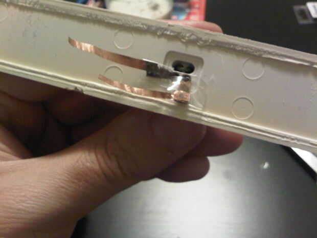 Es un poco difícil de explicar (y aún más difícil de fotografiar), pero realmente sólo cinta el tiras de cobre a los dos segmentos de conector desnudo en la parte inferior de la tira EL.