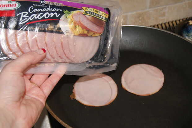 Brown 2 rebanadas de tocino canadiense (en el medio, un minuto cada lado)