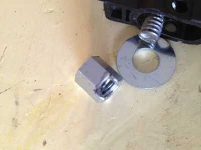 La tuerca de acoplamiento debe ser "clavado" en el eje del tornillo. Corte parte de la tuerca de acoplamiento para la soldadura al tornillo. Quité el tornillo del conjunto del ajuste para la soldadura real. De lo contrario, habría sido dañada la caja de plástico. Asegúrese de poner la arandela en el tornillo antes de soldar la tuerca de acoplamiento al tornillo (segunda foto).